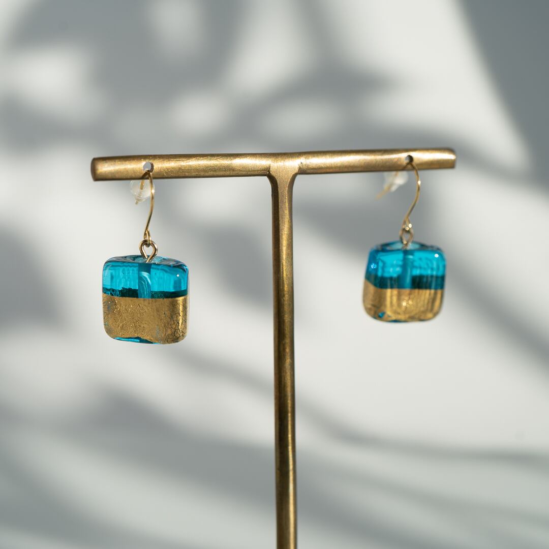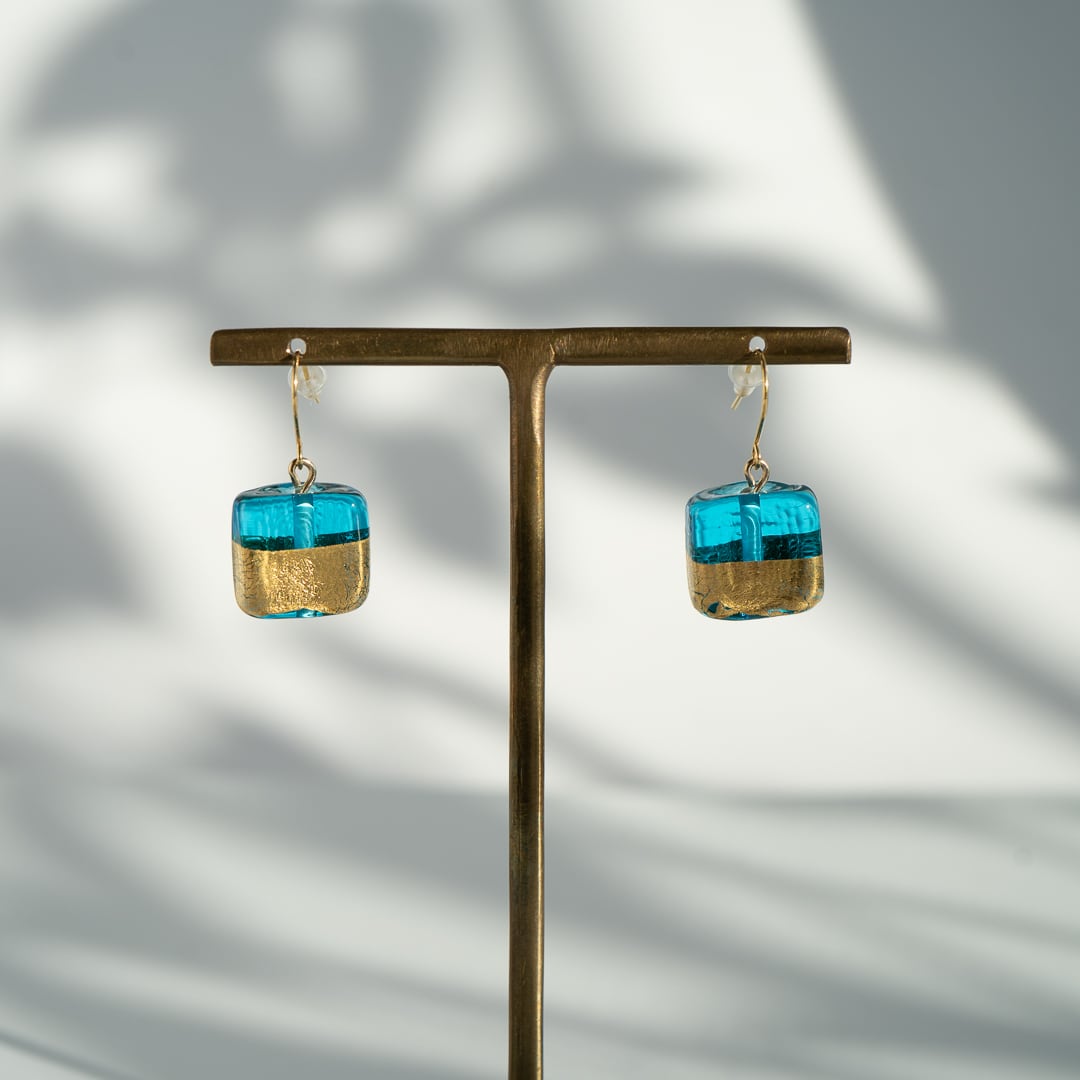チェコガラス ハーフゴールド ピアス スクエア ブルー